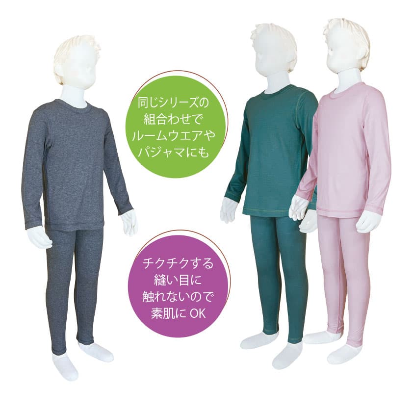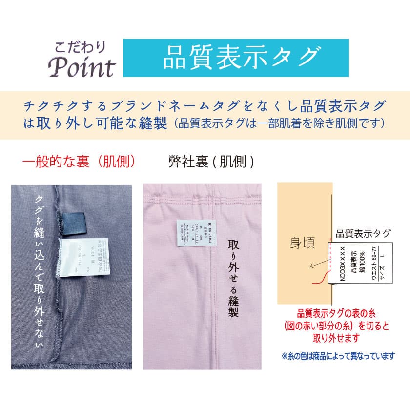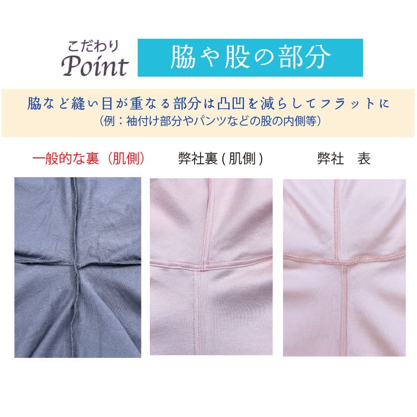 通常肌側にあるチクチク縫い目(縫い代)が肌に触れないオリジナルの安心縫製。表も見た目に綺麗な仕上がり。裾やウエストは表に折り曲げ肌側はフラット。