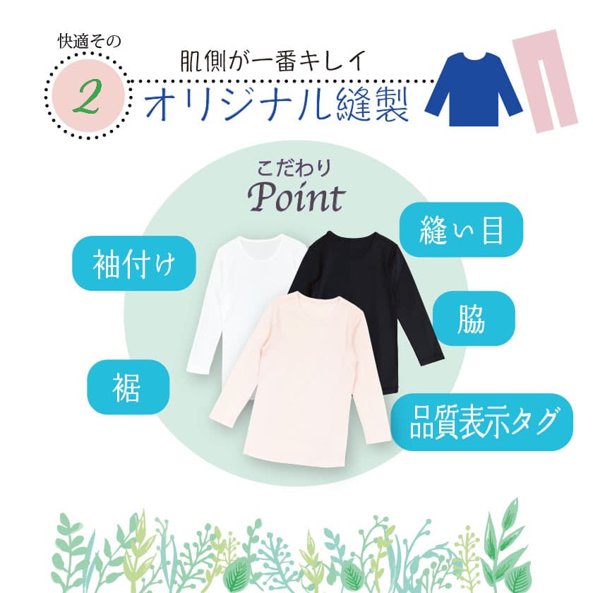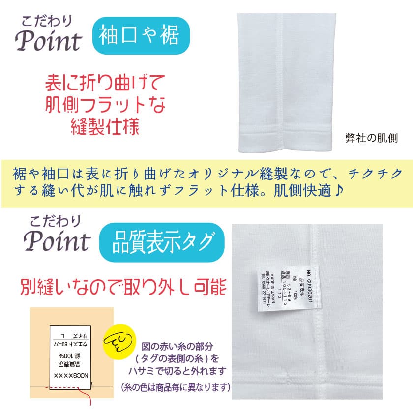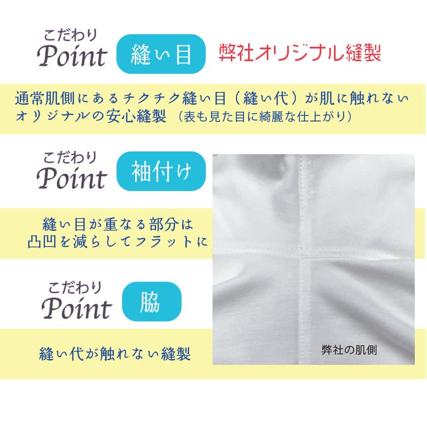通常肌側にあるチクチク縫い目(縫い代)が肌に触れないオリジナルの安心縫製。表も見た目に綺麗な仕上がり。