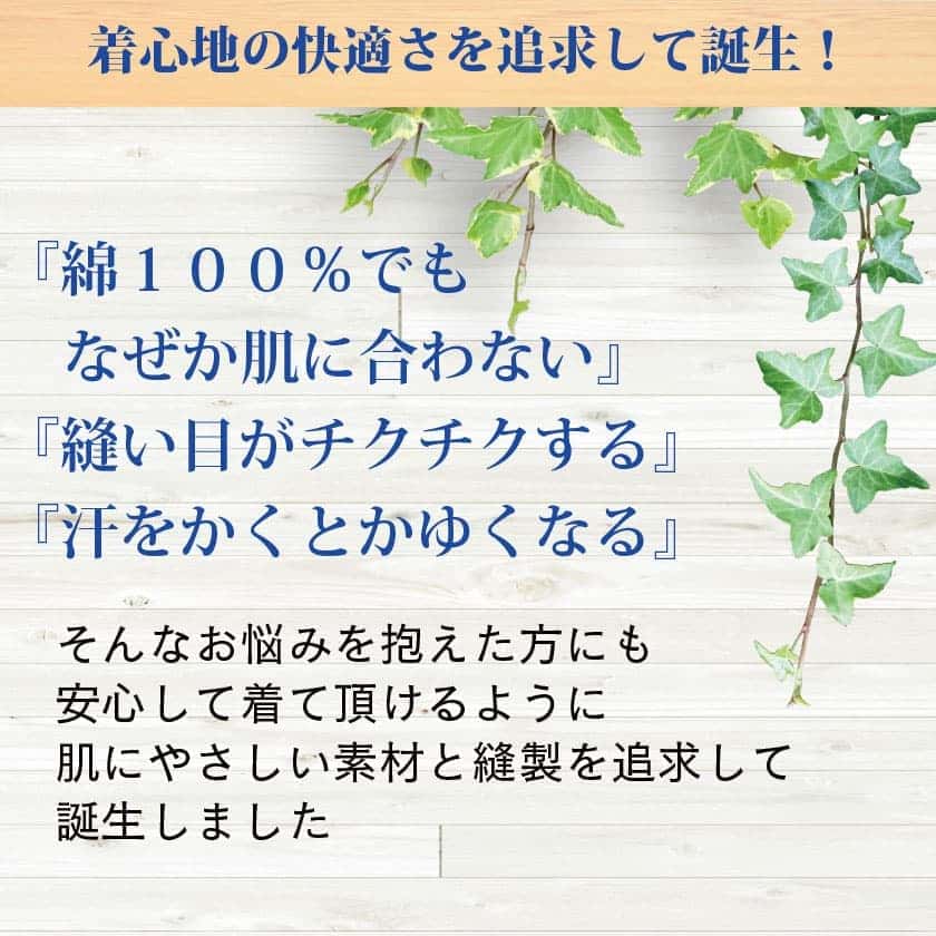 そんなお悩みを抱えた方にも安心して着ていただけるように肌にやさしい素材と縫製を追求して誕生しました。