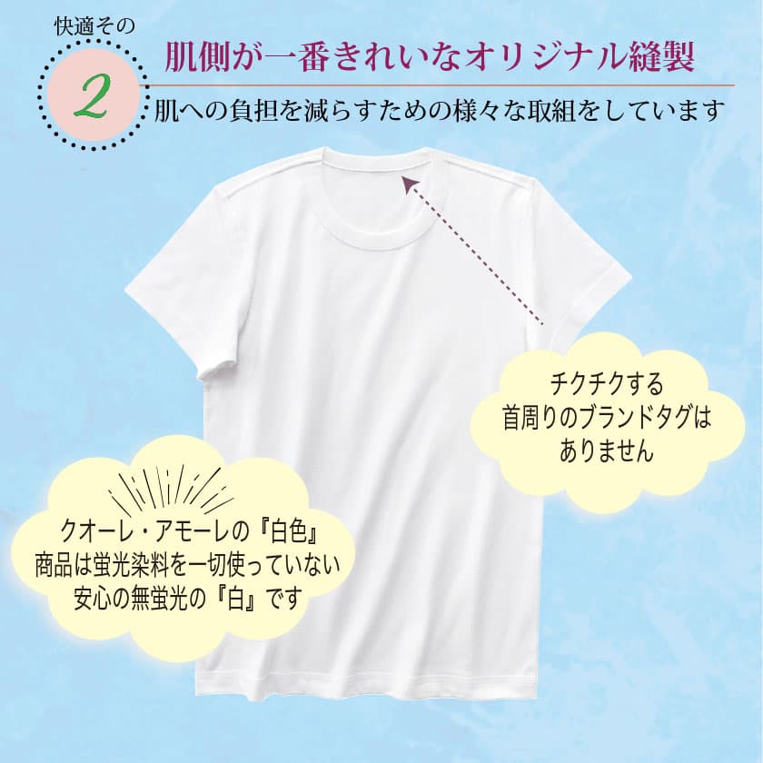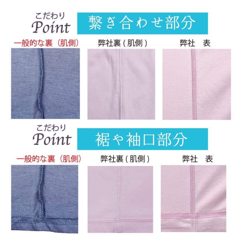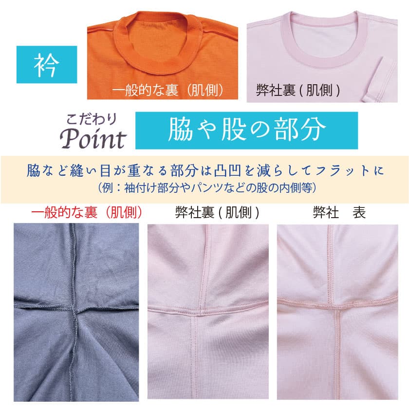 通常肌側にあるチクチク縫い目(縫い代)が肌に触れないオリジナルの安心縫製。表も見た目に綺麗な仕上がり。裾や袖口は表に折り曲げ肌側はフラット。チクチクする首周りのブランドタグはありません。