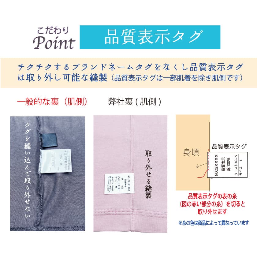 肌側の品質表示タグは、縫い込まず後から別縫いをしているので、完全に取り外すことができます。