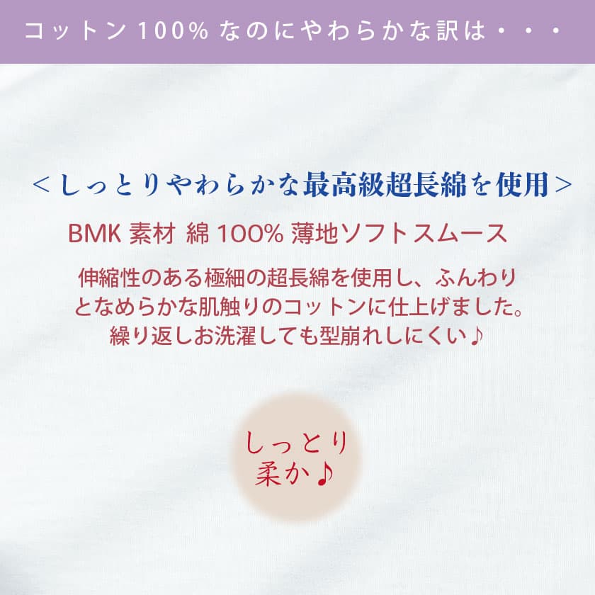 BMK素材 綿100%薄地ソフトスムースは、しっとり柔らかな最高級超長綿を使用。伸縮性のある極細の超長綿を使用しふんわりとなめらかな肌触りのコットンに仕上げました。繰り返しお洗濯しても型崩れしにくい♪