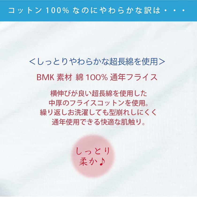 BMK®超低刺激コットン®は綿を異物と感じにくいため、肌への負担が少なく快適♪保湿効果が高く乾燥対策にも最適です!この素材は肌に優しい天然由来の有効成分と、コンタクトレンズのコーティングや人工血管にも使われる程の高い生体親和性と親水性を持つ成分素材を、ナノテクノロジーによって生地(繊維)に加工したものです。この素材は限りなく人の肌に近く、皮膚を保護して体内から水分などが失われることを防ぐバリア機能の回復効果があると言われています。また、超親水性、吸放湿性、高消臭性、帯電防止性などの昨日も併せ持っています。大学病院皮膚科での臨床試験において肌ケア素材として先生や患者さんから安全性、使用感と共に高い評価を頂いております。肌に優しい生地作りからデザイン、生産、ホルマリン検査に至るまで、全て日本国内で大切に作られています。
