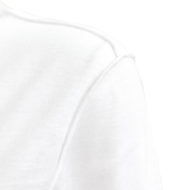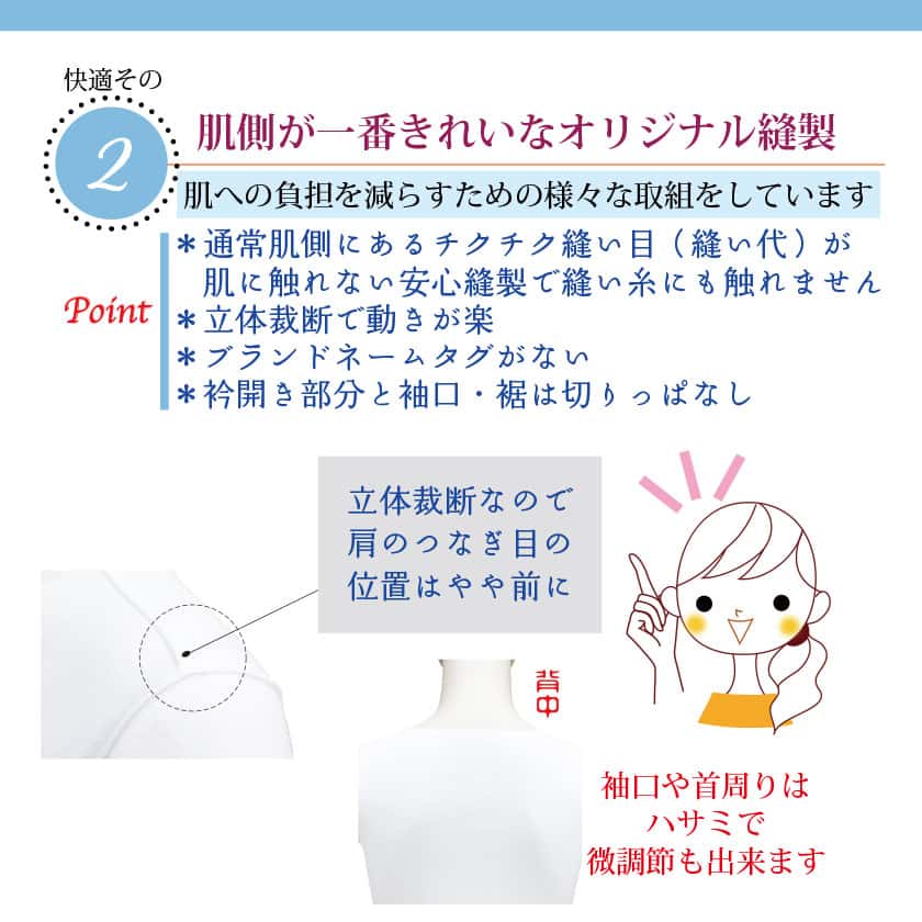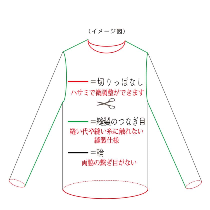 通常肌側にあるチクチク縫い目(縫い代)が肌に触れないオリジナルの安心縫製。縫い糸も肌に触れません。周囲は切りっぱなし仕様。