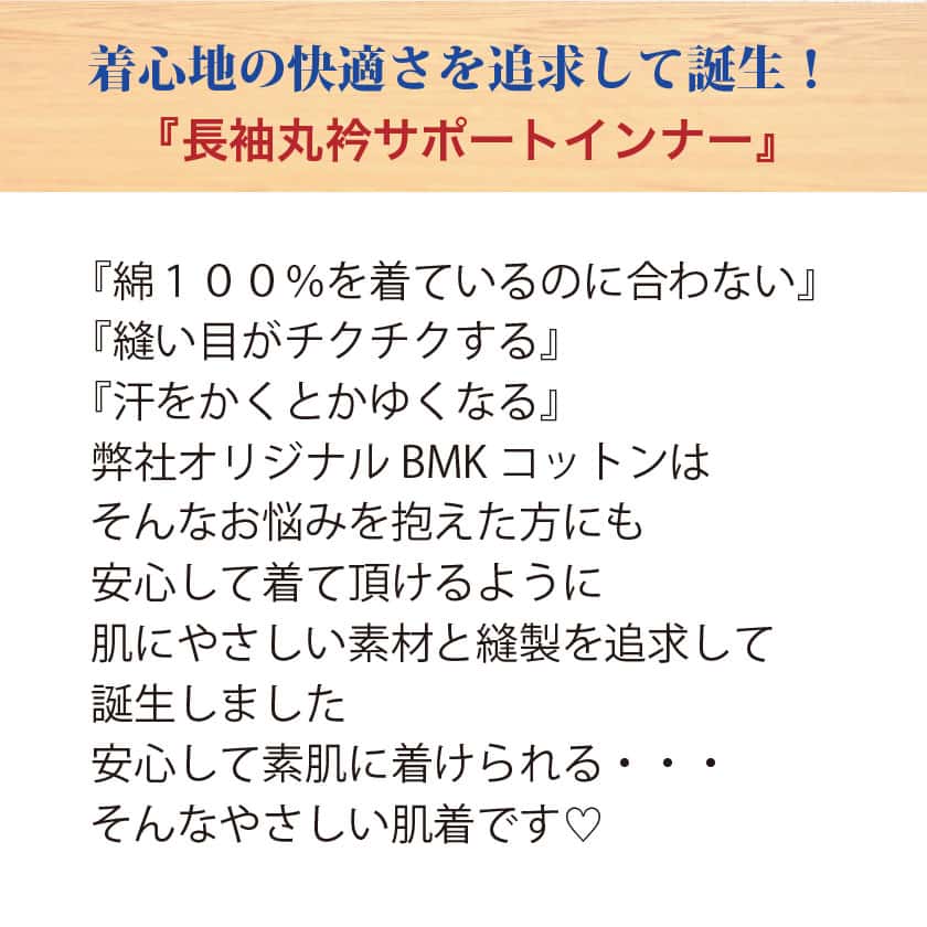 アトピー・敏感肌専用のBMK®超低刺激コットン®で素肌に安心!切りっぱなし&縫い糸に触れない、すべて超低刺激コットン100%の肌にやさしい長袖丸衿肌着です。