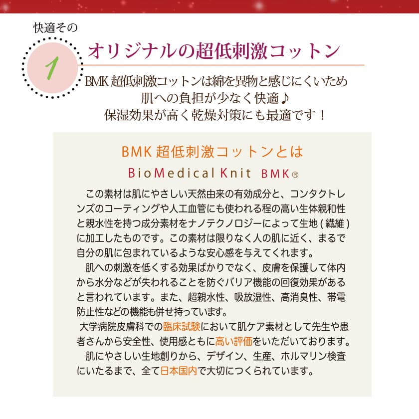 BMK超低刺激コットンは綿を異物と感じにくいため、肌への負担が少なく快適♪保湿効果が高く乾燥対策にも最適です!この素材は肌に優しい天然由来の有効成分と、コンタクトレンズのコーティングや人工血管にも使われる程の高い生体親和性と親水性を持つ成分素材を、ナノテクノロジーによって生地(繊維)に加工したものです。この素材は限りなく人の肌に近く、皮膚を保護して体内から水分などが失われることを防ぐバリア機能の回復効果があると言われています。また、超親水性、吸放湿性、高消臭性、帯電防止性などの昨日も併せ持っています。大学病院皮膚科での臨床試験において肌ケア素材として先生や患者さんから安全性、使用感と共に高い評価を頂いております。肌に優しい生地作りからデザイン、生産、ホルマリン検査に至るまで、全て日本国内で大切に作られています。