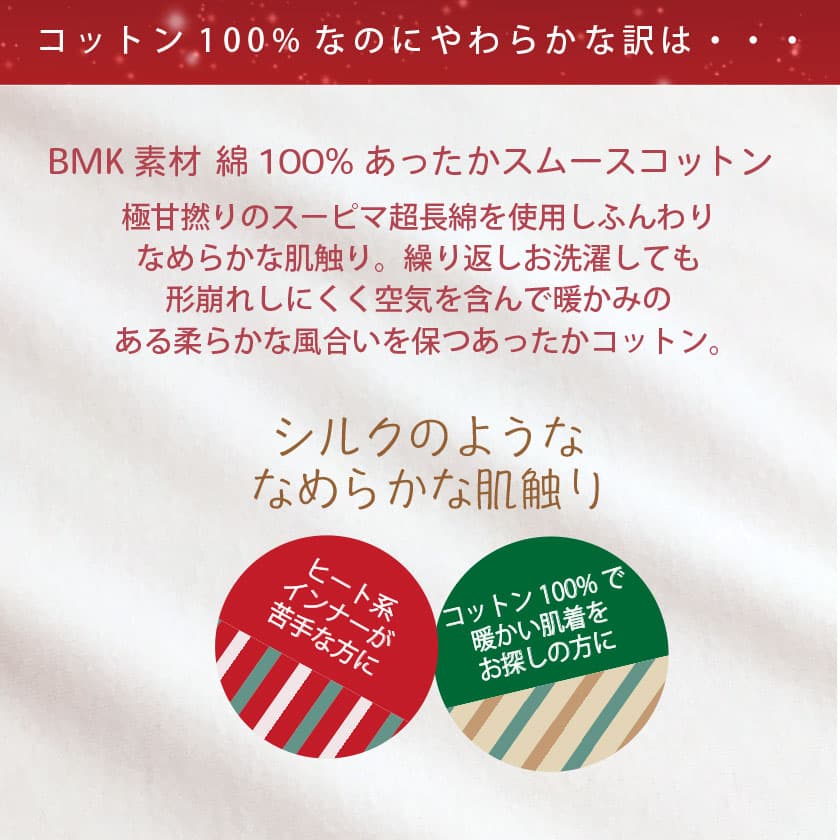 BMK素材 綿100%あったかスムースコットンは、極甘撚りのスーピマ超長綿を使用しふんわりなめらかな肌触り。繰り返しお洗濯しても形崩れしにくく空気を含んで暖かみのある柔らかな風合いを保つあったかコットン。ヒート系インナーが苦手な方やコットン100%で暖かい肌着をお探しの方におすすめです。