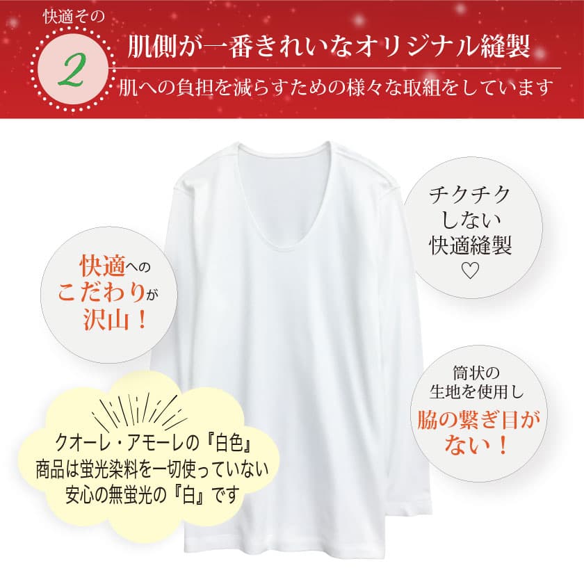 極甘撚りのスーピマ超長綿を使用したなめらかな生地に、アトピー・敏感肌にもやさしいオリジナルのBMK®加工を施した超低刺激コットン®を使用。肌側に縫い代がチクチク触れない縫製で快適をさらにサポートします。空気を含んで暖かみのある風合いを保ち、ふんわり柔らかな肌触り。静電気が帯電しにくい素材で、特に冬場は、ウールのニットなどと重ね着してもパチパチしにくく、ストレスなく過ごせます。特に肌が弱い方や、化繊のヒート系インナーが苦手な方におすすめの綿100%あったかインナーです。