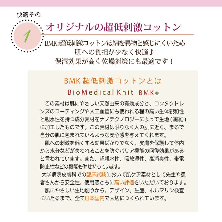 BMK超低刺激コットンは綿を異物と感じにくいため、肌への負担が少なく快適♪保湿効果が高く乾燥対策にも最適です!この素材は肌に優しい天然由来の有効成分と、コンタクトレンズのコーティングや人工血管にも使われる程の高い生体親和性と親水性を持つ成分素材を、ナノテクノロジーによって生地(繊維)に加工したものです。この素材は限りなく人の肌に近く、皮膚を保護して体内から水分などが失われることを防ぐバリア機能の回復効果があると言われています。また、超親水性、吸放湿性、高消臭性、帯電防止性などの昨日も併せ持っています。大学病院皮膚科での臨床試験において肌ケア素材として先生や患者さんから安全性、使用感と共に高い評価を頂いております。肌に優しい生地作りからデザイン、生産、ホルマリン検査に至るまで、全て日本国内で大切に作られています。