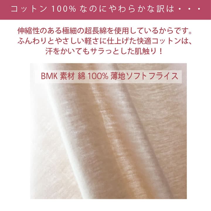 BMK素材 綿100%薄地ソフトフライスは、伸縮性のある極細の超長綿を使用しふんわりとやさしい軽さに仕上げました。汗をかいてもサラッと快適な肌触り。身幅毎に特別に筒状に編み立てていますので、脇の縫い目がなく快適。