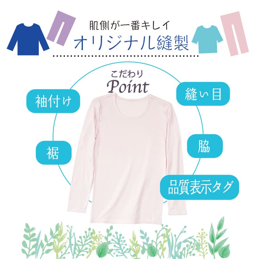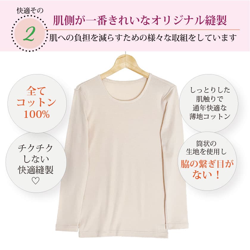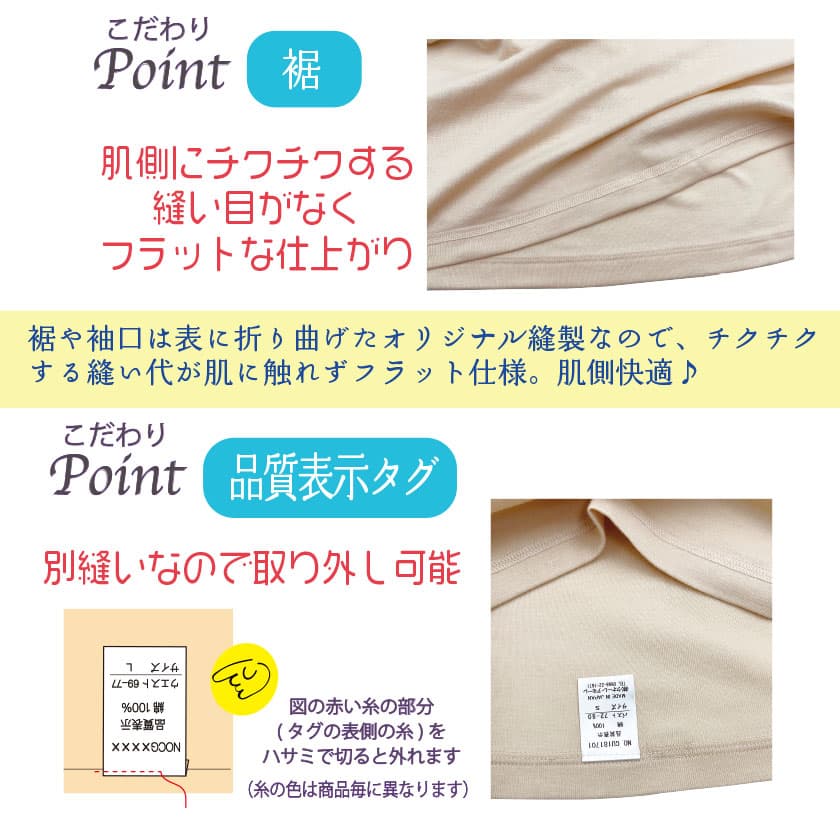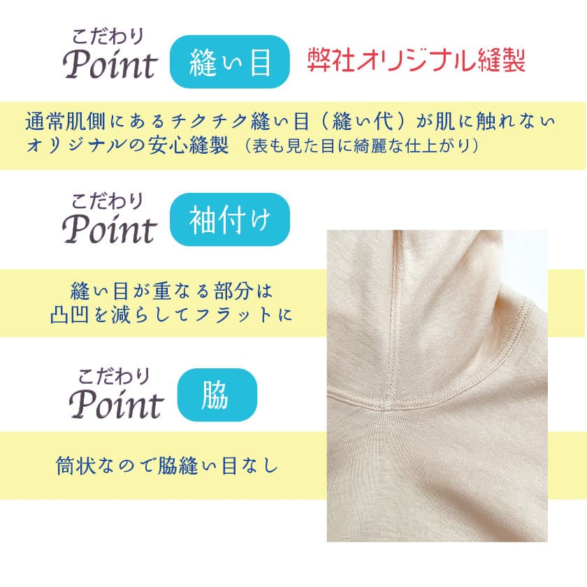 通常肌側にあるチクチク縫い目(縫い代)が肌に触れないオリジナルの安心縫製。表も見た目に綺麗な仕上がり。