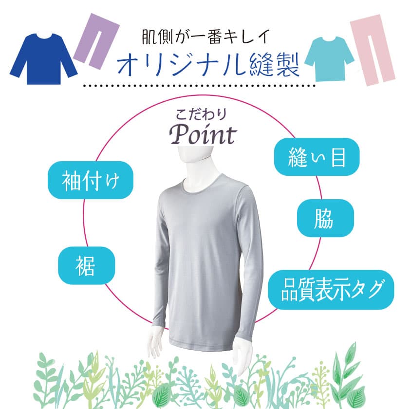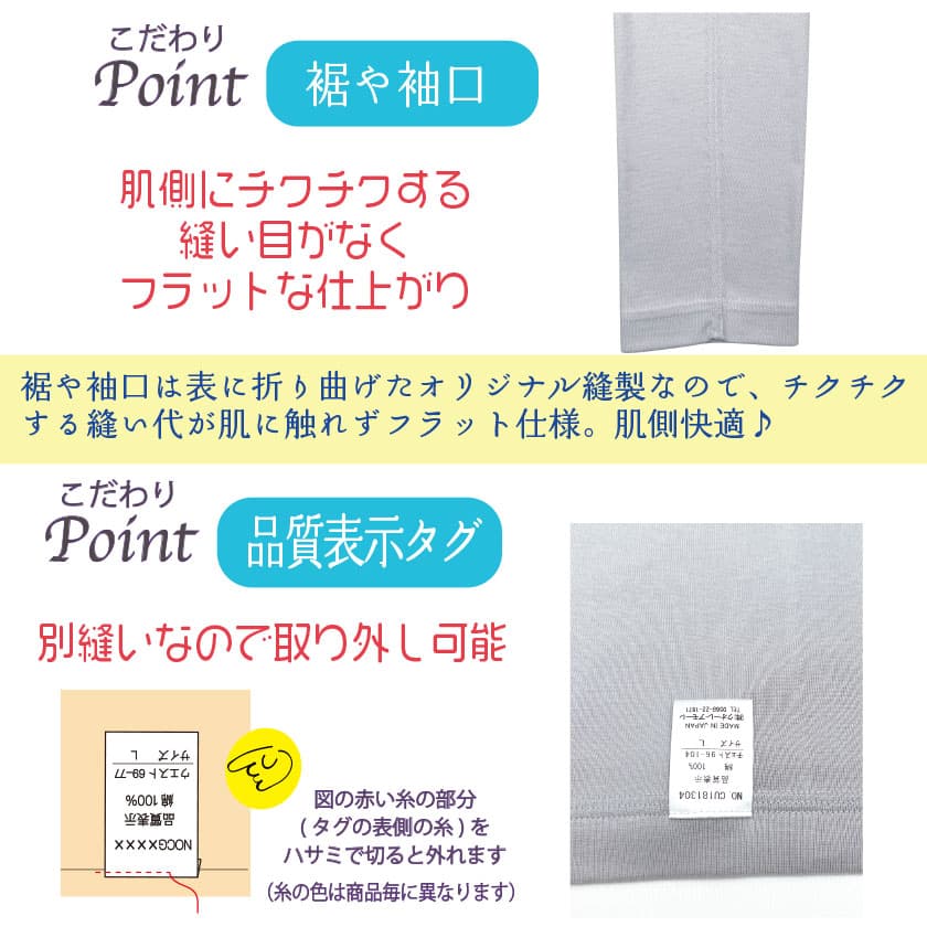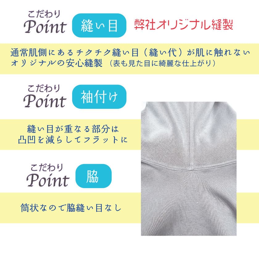 通常肌側にあるチクチク縫い目(縫い代)が肌に触れないオリジナルの安心縫製。