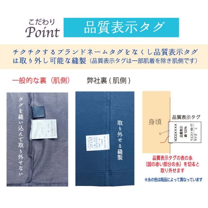 肌側の品質表示タグは、縫い込まず後から別縫いをしているので、完全に取り外すことができます。