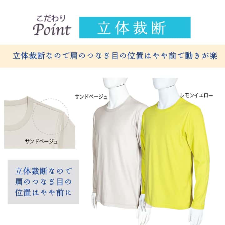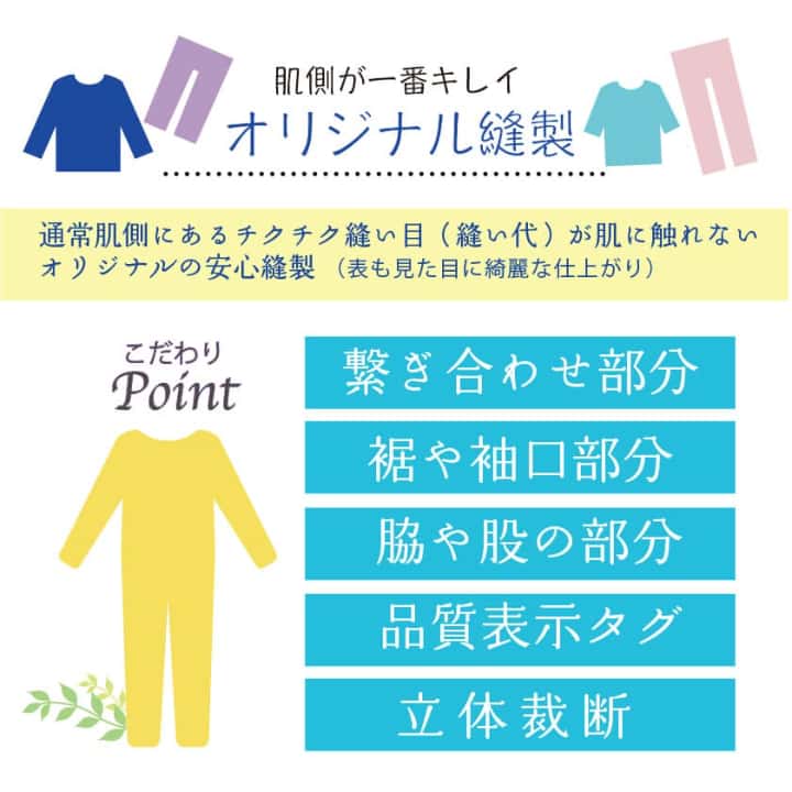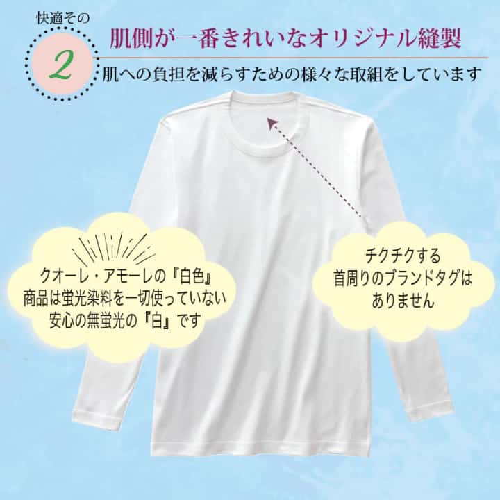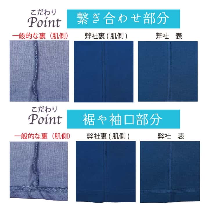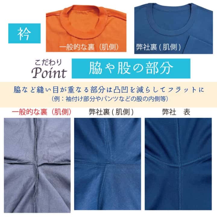 通常肌側にあるチクチク縫い目(縫い代)が肌に触れないオリジナルの安心縫製。表も見た目に綺麗な仕上がり。裾や袖口は表に折り曲げ肌側はフラット。チクチクする首周りのブランドタグはありません。